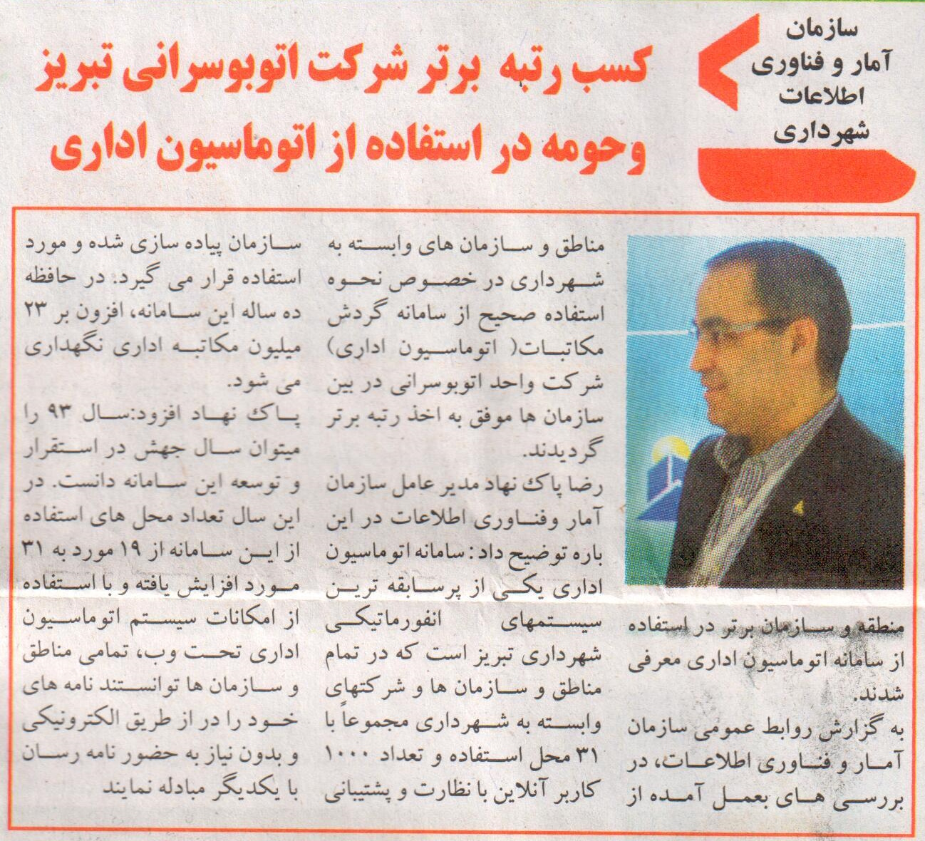 کسب رتبه برتر شرکت اتوبوسرانی تبریز و حومه دراستفاده از اتوماسیون اداری