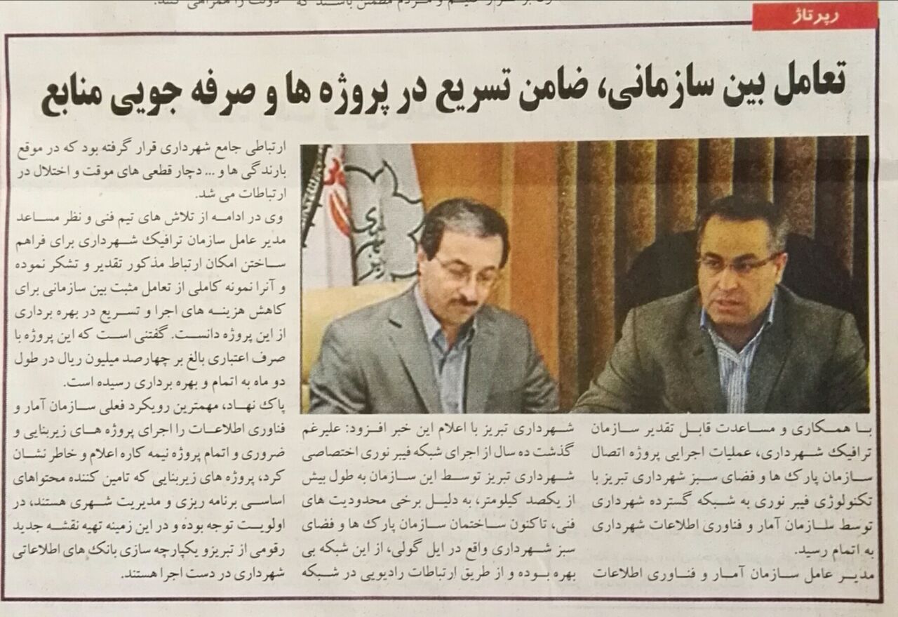 با همکاری و مساعدت قابل تقدیر سازمان ترافیک شهرداری، عملیات اجرایی پروژه اتصال سازمان پارک ها و فضای سبز شهرداری تبریز با تکنولوژی فیبر نوری به شبکه گسترده شهرداری توسط سازمان آمار و فناوری اطلاعات شهرداری به اتمام رسید. مدیر عامل سازمان آمار و فناوری اطلاعات شهرداری تبریز با اعلام این خبر افزود: علیرغم گذشت ده سال از اجرای شبکه فیبر نوری اختصاصی شهرداری تبریز توسط این سازمان به طول بیش از یکصد کیلومتر، به دلیل برخی محدودیت های فنی، تاکنون ساختمان سازمان پارک ها و فضای سبز شهرداری واقع در ایل گولی، از این شبکه بی بهره بوده و از طریق ارتباطات رادیویی در شبکه ارتباطی جامع شهرداری قرار گرفته بود که در موقع بارندگی ها و ... دچار قطعی های موقت و اختلال در ارتباطات می شد. وی در ادامه از تلاش های تیم فنی و نظر مساعد مدیر عامل سازمان ترافیک شهرداری برای فراهم ساختن امکان ارتباط مذکور تقدیر و تشکر نموده و آنرا نمونه کاملی از تعامل مثبت بین سازمانی برای کاهش هزینه های اجرا و تسریع در بهره برداری از این پروژه دانست. گفتنی است که این پروژه با صرف اعتباری بالغ بر چهارصد میلیون ریال در طول دو ماه به اتمام و بهره برداری رسیده است.