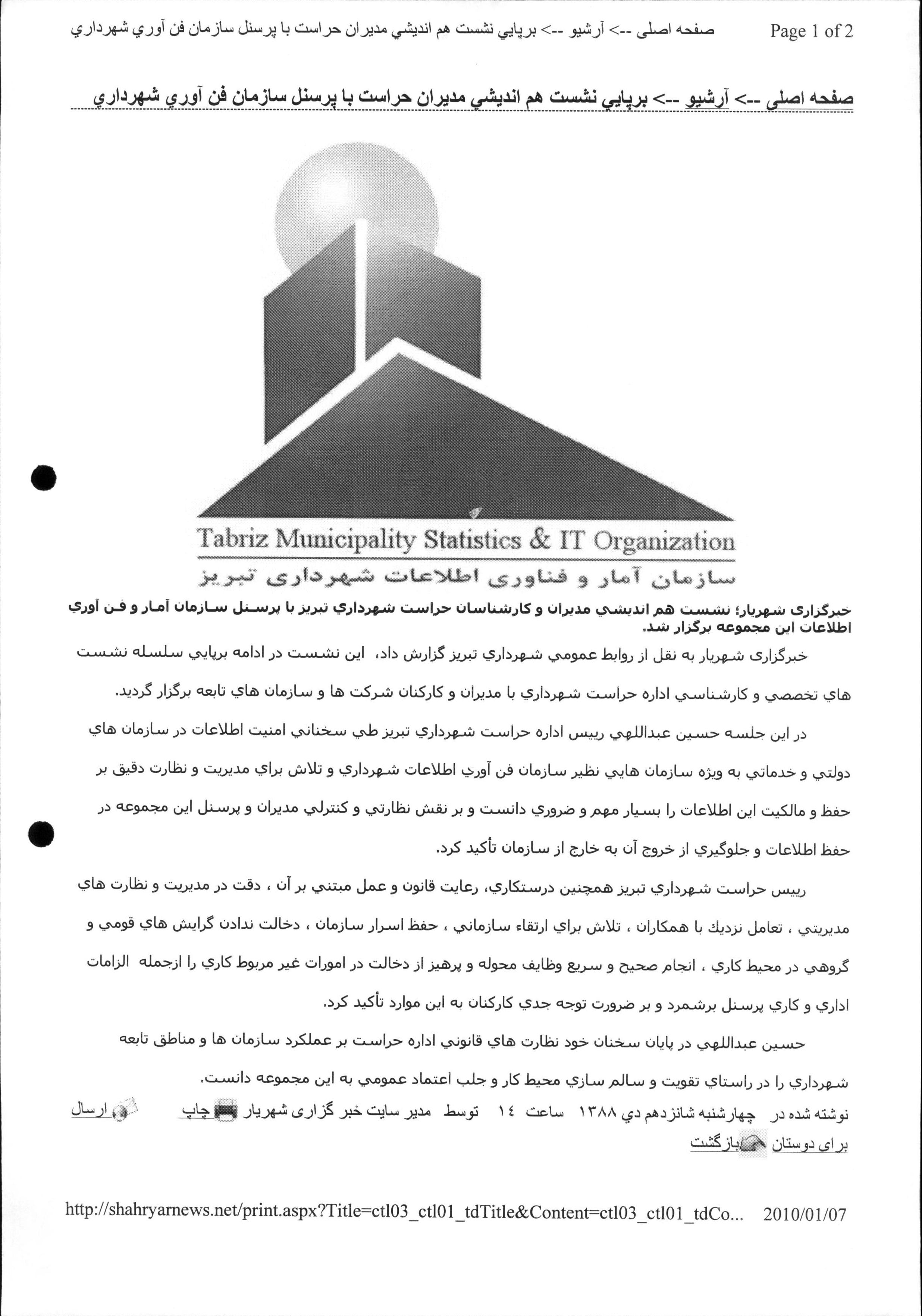 خبرگزاری شهریار به نقل از روابط عمومی شهرداری تبریز گزارش داد این نشست در ادامه برپایی سلسله نشست هاي تخصصي و کارشناسی اداره حراست شهرداری با مدیران و کارکنان شرکتها و سازمانهای تابعه برگزار گردید.