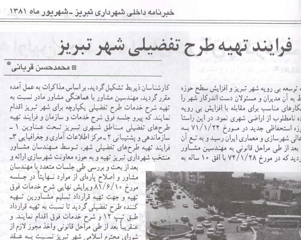 نمايند. كه پيروجلسه فوق شرح خدمات و سازمان و فرآيند تهيه طرح هاي تفضيلي مناطف شهري تبريز تحت عناوين 1- سازماندهي و پشتيباني2- مركز اطلاعات آماري و جغرافيايي3- فرآيند تهيه طرح هاي تفضيلي شهر، توسط مهندسان مشاور منتخب شهرداري تبريز تهيه  و به حوزه معاونت شهرسازي ارايه و  بعد از بحث دو بررسي طي جلسات متعدد با مهندسان مشاور و اصلاح پاره اي از موارد نهايتاً در جلسه مورخ 10/6/81 ويرايش نهايي شرح خدمات فوق تهيه و جهت تهيه قرارداد تسليم مشاورين تهيهكننده طرح تفضيلي گرديد تا نسبت به تهيه قرارداد طبق تيپ 12 و شرح خدمات فوق اقدام نمايند. و عنقريباً بعد از طي مراحل قانوني و اخذ مجوز لازم از شوراي محترم اسلامي شهر تبريز نسبت به عقد قرارداد نهايي اقدام مقتضي به عمل خواهد آمد.